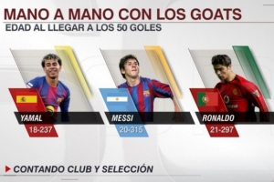 据统计,18岁237天的亚马尔生涯各项赛事已经打进50粒进球(俱乐部+国家队),梅西打进生涯50球时为20岁315天,C罗则是21岁297天。