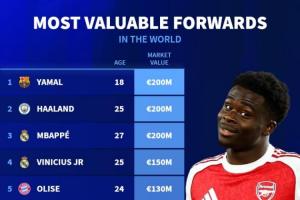 明日更新英超身价!前锋身价榜:亚马尔 哈兰德 姆巴佩2亿欧居首