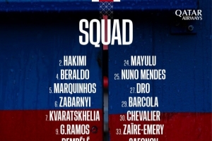 前锋:7-克瓦拉茨赫利亚、9-贡萨洛·拉莫斯、10-登贝莱、14-杜埃、29-巴尔科拉、49-姆巴耶