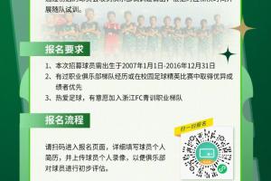 体育资讯02月13日讯 浙江FC宣布对2007-2016年龄段梯队进行补强选拔,并公开了报名流程。